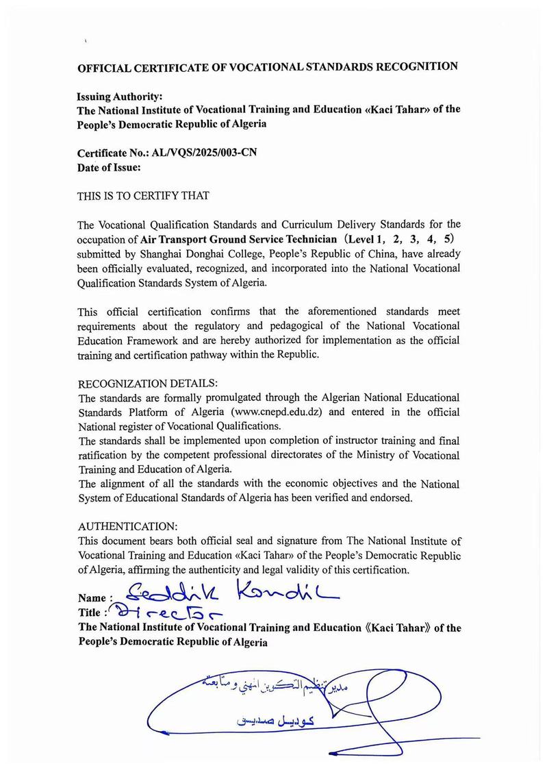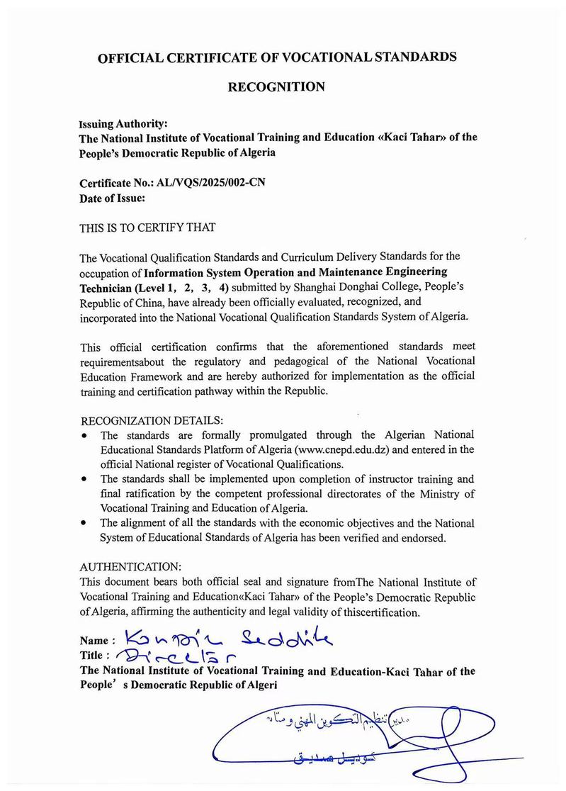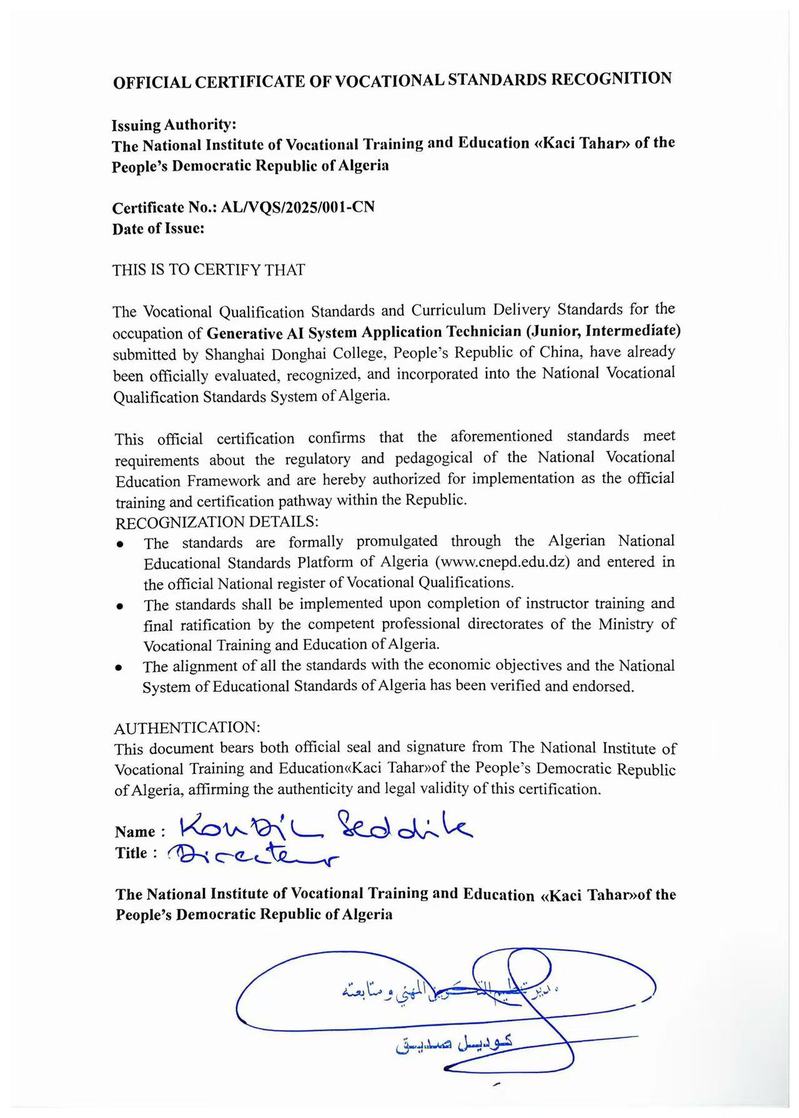 日前,我校“生成式人工智能系统应用员”等三项职业标准获得阿尔及利亚人民民主共和国国家职业培训与教育中心书面认证。这是东海学院职教出海、输出中国职教成果的又一标志性成果,也是阿尔及利亚首次委托制订并核准的国际职业标准,彰显东海学院优势特色专业建设水准和国际职业教育先锋地位。